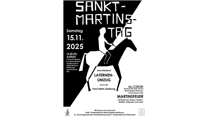 16:30 Uhr mit Sankt-Martins- und Laternenlieder auf dem Vorplatz der Ev. Gedenkkirche Plötzensee (Heckerdamm 226)